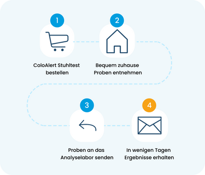 Der ColoAlert Stuhltest zur Darmkrebsvorsorge wurde entwickelt, um späte Diagnosen von Darmkrebs zu vermeiden. Im Unterschied zu herkömmlichen Stuhltests (iFOBT), die lediglich auf verborgenes Blut im Stuhl prüfen, analysiert ColoAlert die Proben zusätzlich auf Tumor-DNA. Dadurch kann Darmkrebs deutlich früher erkannt werden. Tumor-DNA sind genetische Marker, die von Tumoren im Darm in den Stuhl abgegeben werden – und bereits in einem wesentlich früheren Krankheitsstadium nachweisbar sind als Blut.